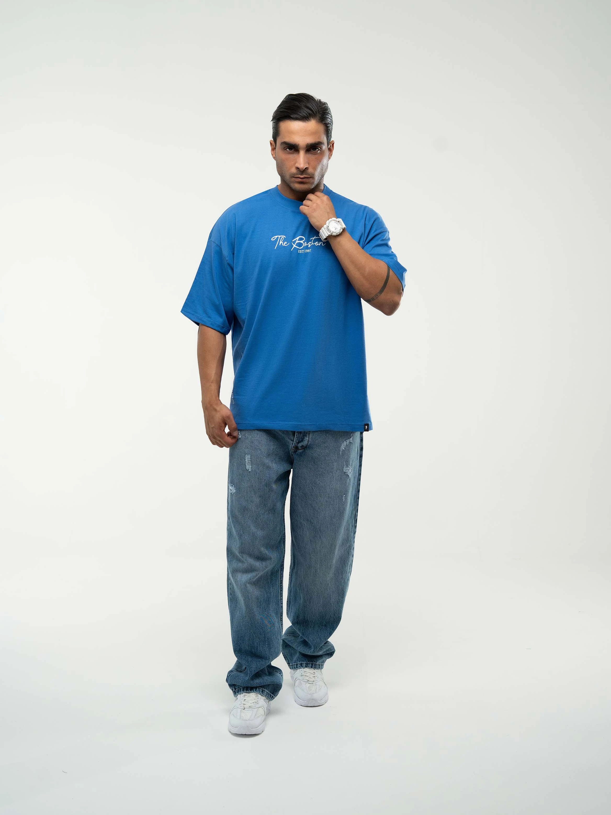 تیشرت لش پارچه پنبه قواره باکسی جلو چاپ مدل Boston رنگ آبی
