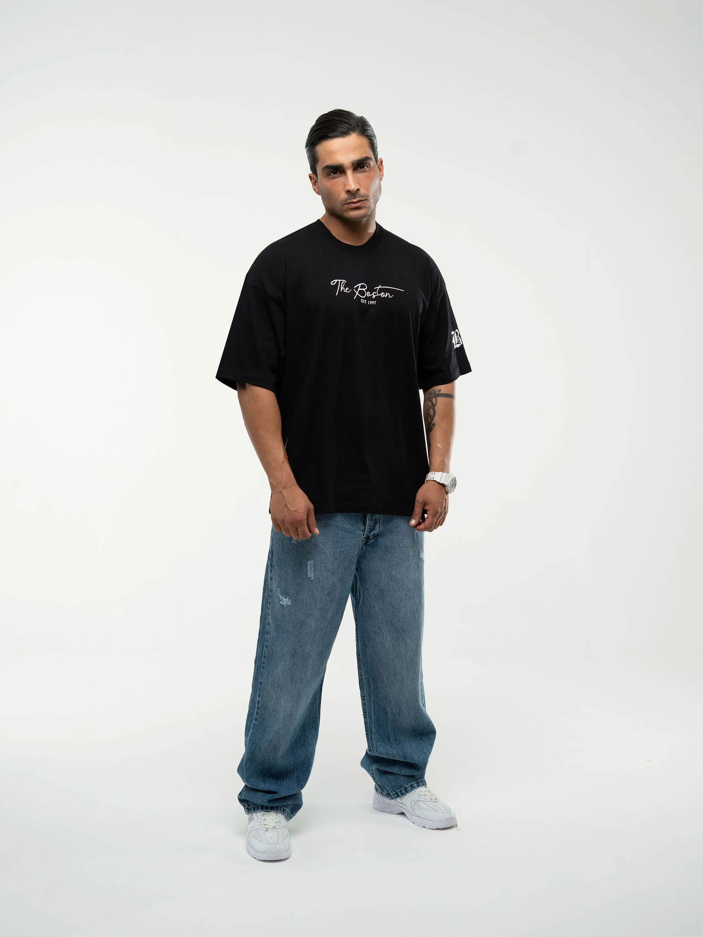 تیشرت لش پارچه پنبه قواره باکسی جلو چاپ مدل Boston رنگ مشکی