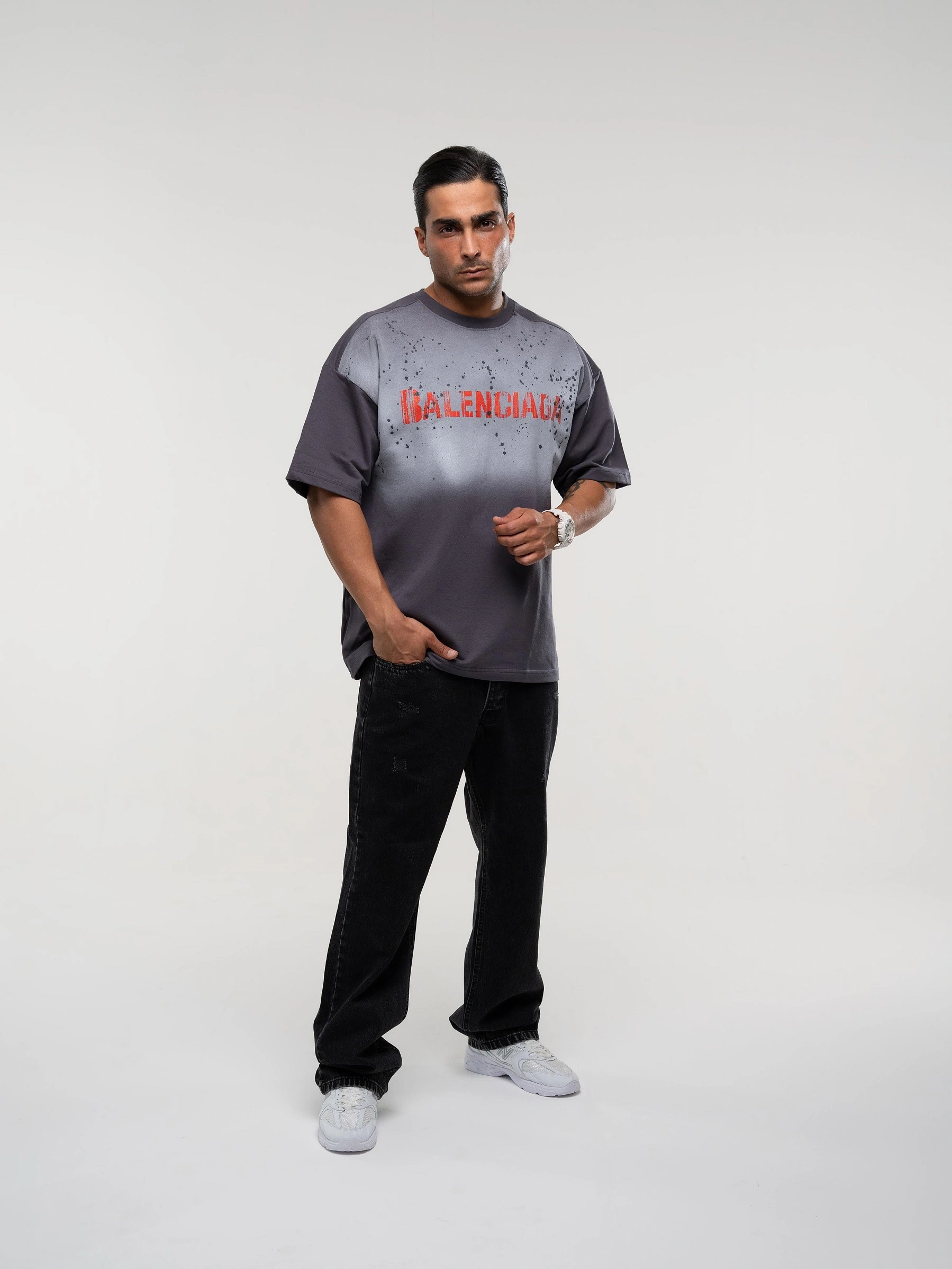 تیشرت لش پارچه دو نخ (دورس) قواره باکسی جلو چاپ و پیسوله مدل Balenciaga رنگ طوسی